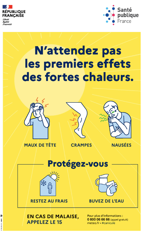 Du 1er juin au 15 septembre chaque année, des campagnes de communications liées aux risques liés aux fortes chaleurs permettent d’informer le grand public sur les précautions à prendre et à adapter selon l’âge ou les niveaux d’exposition spécifiques.